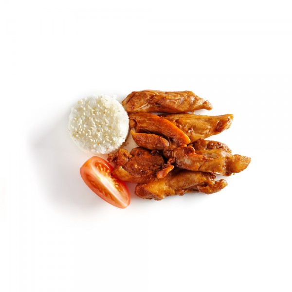 Teriyaki szószban párolt csirke szezámmaggal meghintett rizzsel tálalva.